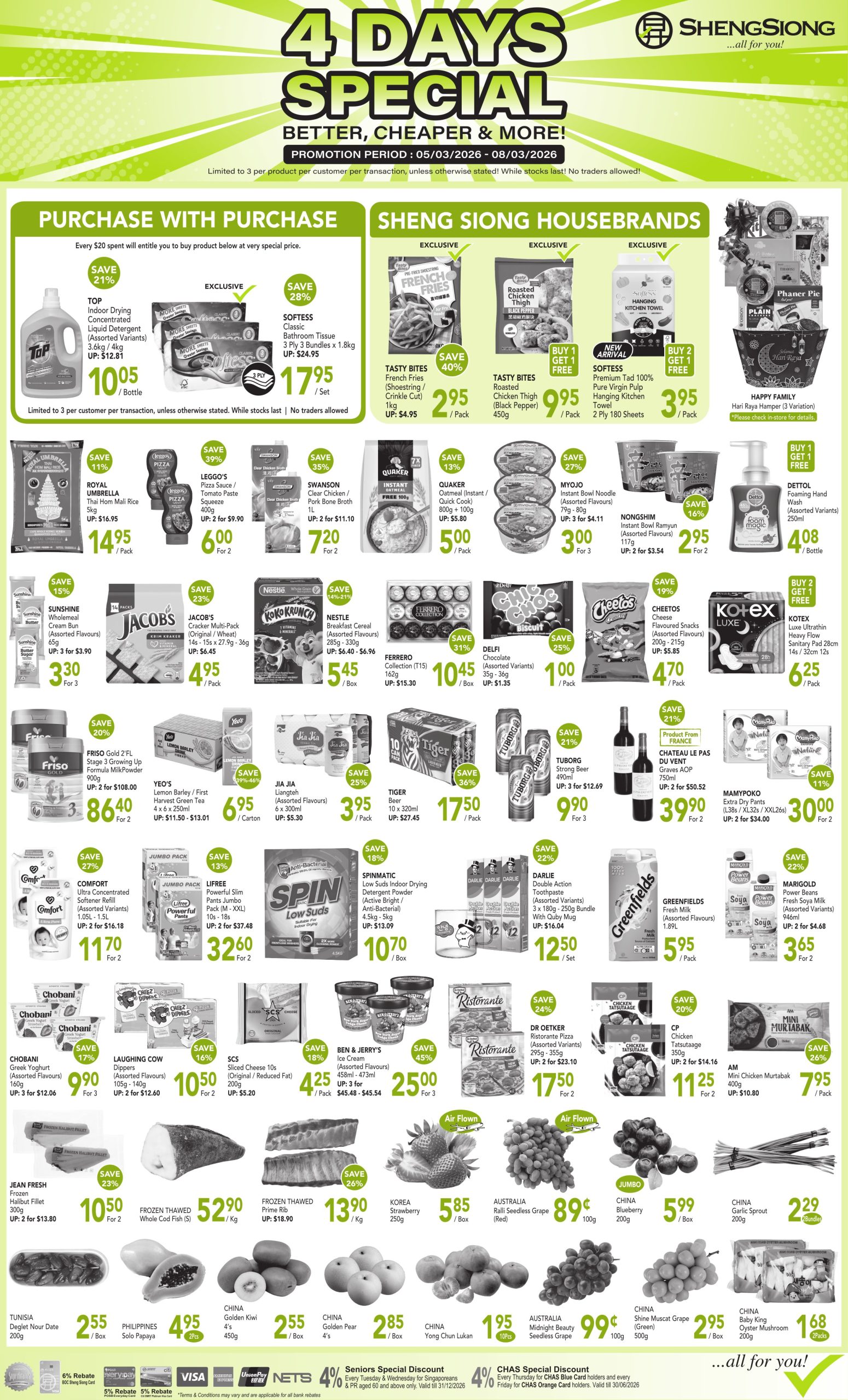 Home Promotions Newspaper Advertisement 4 Days Special 05 Mar 2026 – 08 Mar 2026 4 Days Special 05 Mar 2026 – 08 Mar 2026 March 5, 2026 148 Facebook Twitter Google+ Pinterest WhatsApp DOWNLOAD RELATED ARTICLESMORE FROM AUTHOR Hari Raya Promotion 20 Feb 2026 – 19 March 2026 “UnionPay x Sheng Siong” 4% Senior Citizen Discount Extended to 2026! AIC Life Unstoppable Campaign SG60 Vouchers are accepted at Sheng Siong