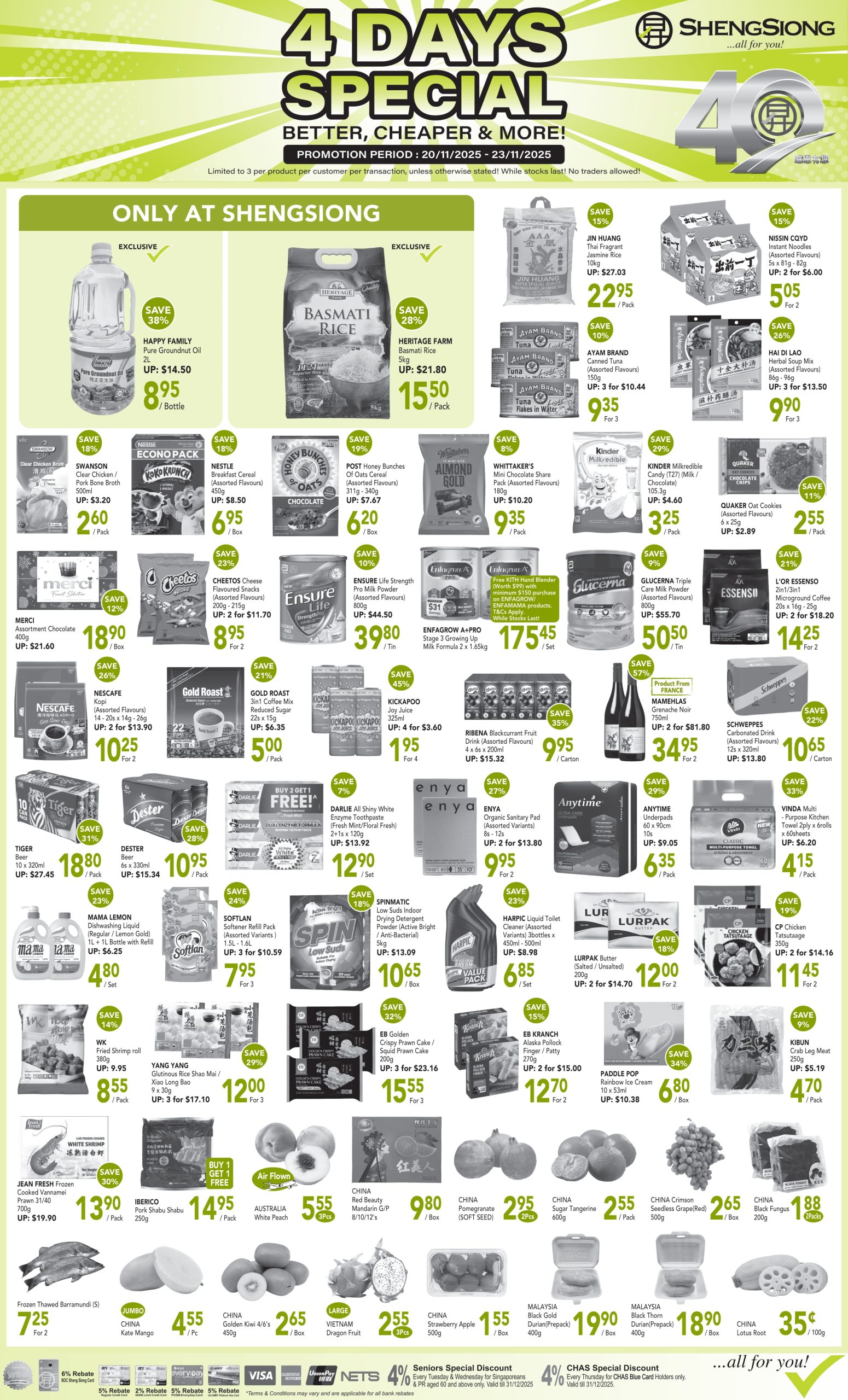 Home Promotions Newspaper Advertisement 4 Days Special 20 Nov 2025 – 23 Nov 2025 4 Days Special 20 Nov 2025 – 23 Nov 2025 November 20, 2025 162 Facebook Twitter Google+ Pinterest WhatsApp DOWNLOAD RELATED ARTICLESMORE FROM AUTHOR Christmas Catalogue 30 Oct 2025 – 02 Jan 2026 Mega Promotion 31 Oct 2025 – 27 Nov 2025 AIC Life Unstoppable Campaign SG60 Vouchers are accepted at Sheng Siong POSB EVERYDAY CARD