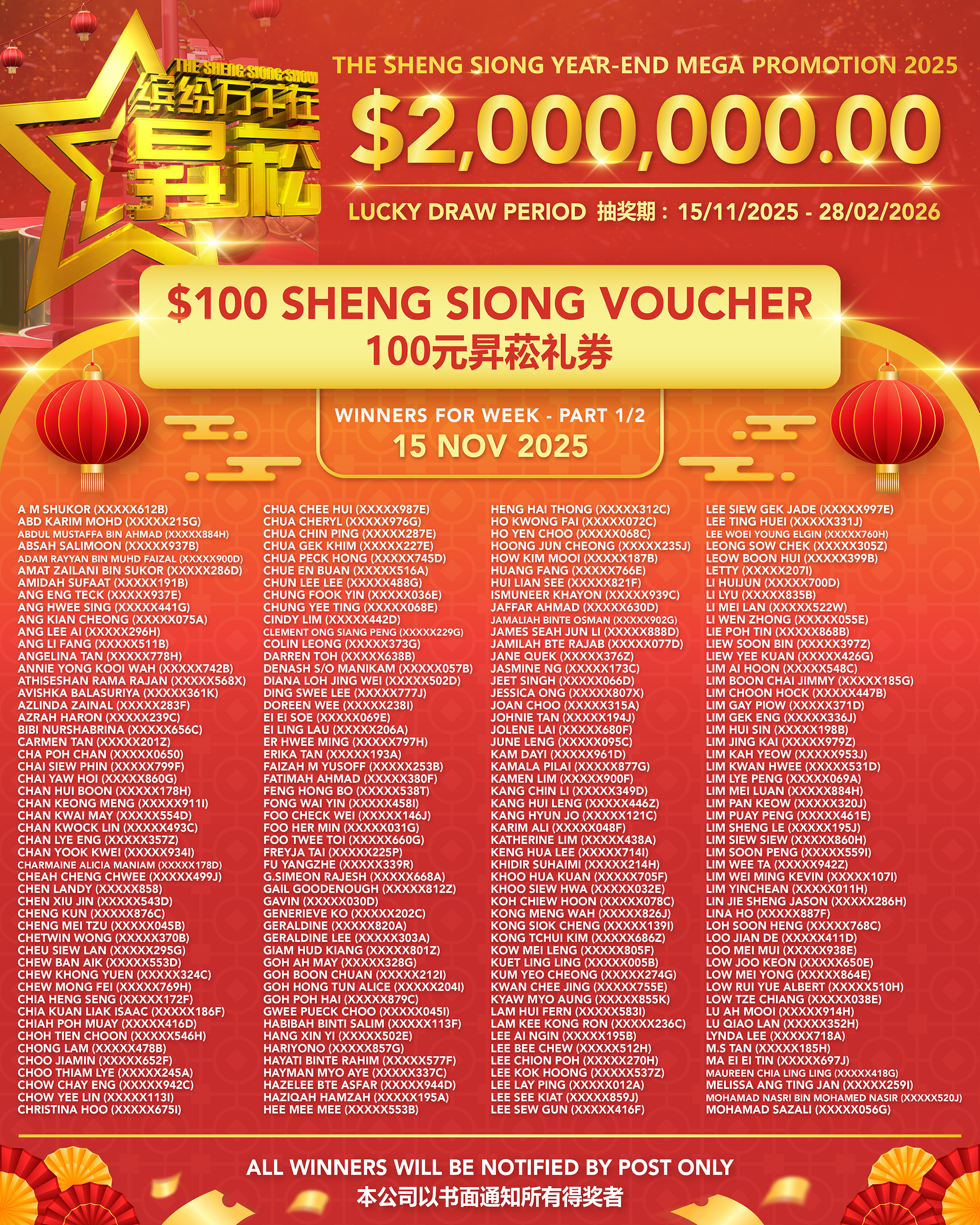 Home News Sheng Siong Show EP1 Winner List (SS 38) Sheng Siong Show EP1 Winner List (SS 38) November 21, 2025 79 Facebook Twitter Google+ Pinterest WhatsApp RELATED ARTICLESMORE FROM AUTHOR Sheng Siong Group’s net profit increases 12.0% to S$43.8 million for 3Q FY2025 Sheng Siong Show EP14 Winner List (SS 37) Sheng Siong Show EP13 Winner List (SS 37) Sheng Siong Show EP12 Winner List (SS 37) Sheng Siong Show EP11 Winner List (SS 37)