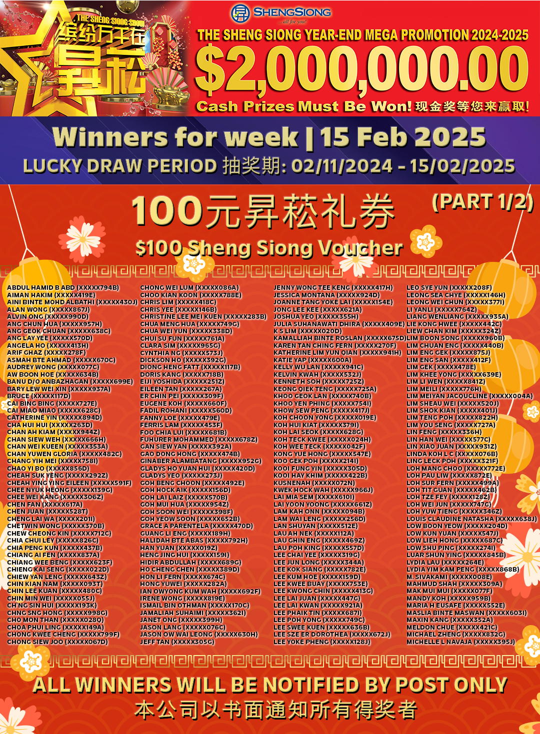 Home News Sheng Siong Show EP14 Winner List (SS 36) Sheng Siong Show EP14 Winner List (SS 36) February 26, 2025 7462 Facebook Twitter Google+ Pinterest WhatsApp RELATED ARTICLESMORE FROM AUTHOR Sheng Siong Show EP1 Winner List (SS 38) Sheng Siong Group’s net profit increases 12.0% to S$43.8 million for 3Q FY2025 Sheng Siong Show EP14 Winner List (SS 37) Sheng Siong Show EP13 Winner List (SS 37) Sheng Siong Show EP12 Winner List (SS 37)