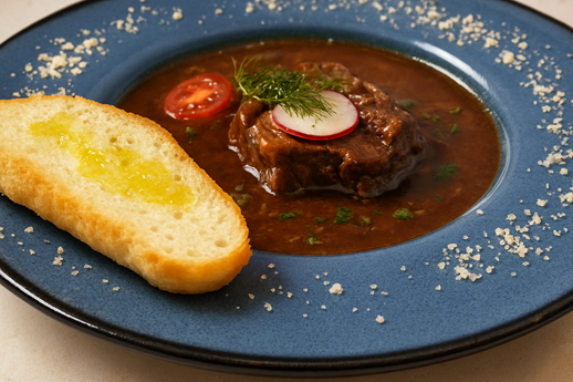 5. Garnish it with a slice of radish, some dill, and cherry tomatoes and a piece of bread to soak up the rich broth.